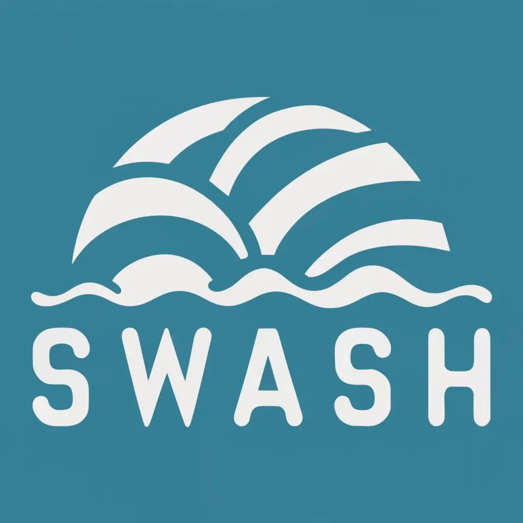 • AI Logo Maker - Logo designed in sky blue and white colors, featuring waves and a basket of yarns, with the text 'Swash' in stylish typography